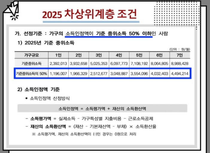 2025년 기준으로, 차상위 계층은 '중위소득의 50% 이하'로 설정되어 있으며, 지역별, 가구원수별로 차등 적용될 수 있습니다. - 기초생활보장수급권자와 차상위계층의 차이